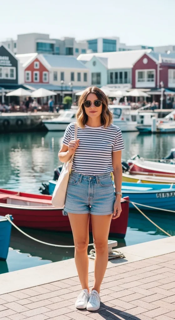 Classic blue denim shorts paired with a navy-and-white striped tee create a timeless coastal look. The stripes subtly reflect nautical vibes while the relaxed silhouette feels perfect for brunch spots near Fremantle Harbour.