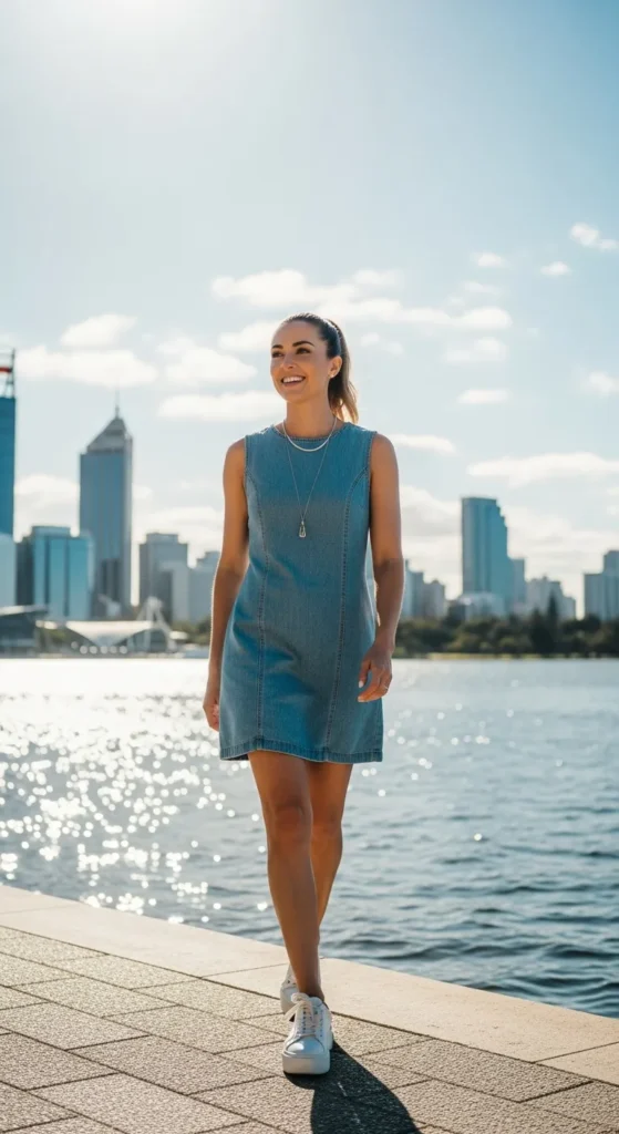A sleeveless denim dress feels youthful and perfect for sightseeing around the city. The structured denim contrasts nicely with the soft coastal environment.