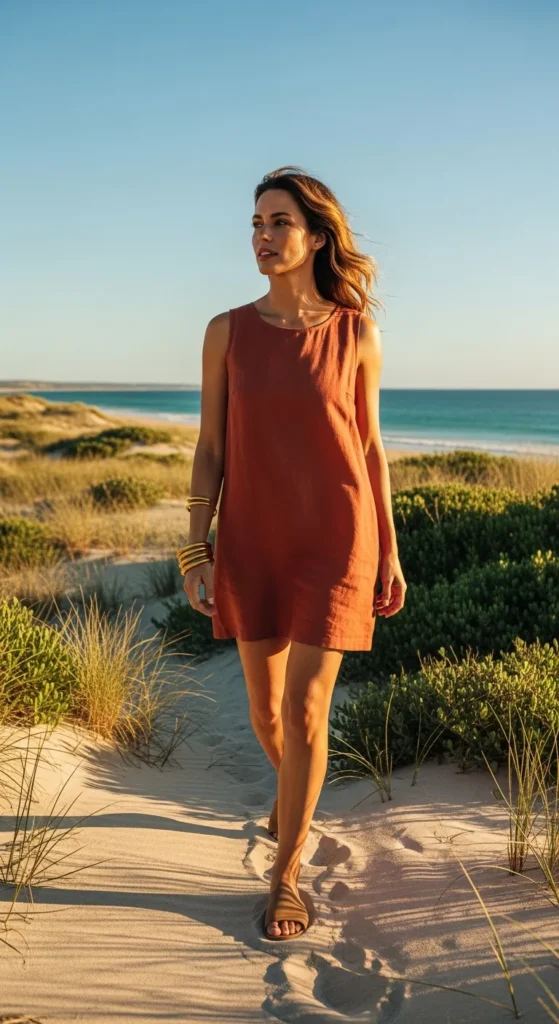 A linen mini dress in soft terracotta tones feels perfectly sun-washed. The natural fabric texture pairs beautifully with Perth’s sandy coastal landscapes.