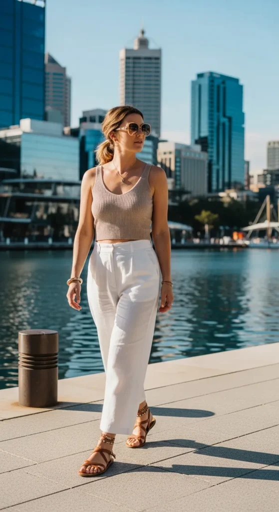 Loose ivory linen wide-leg pants paired with a soft ribbed crop tank create a breathable silhouette perfect for Perth’s warm afternoons. The flowing fabric allows movement while still looking polished and elevated.