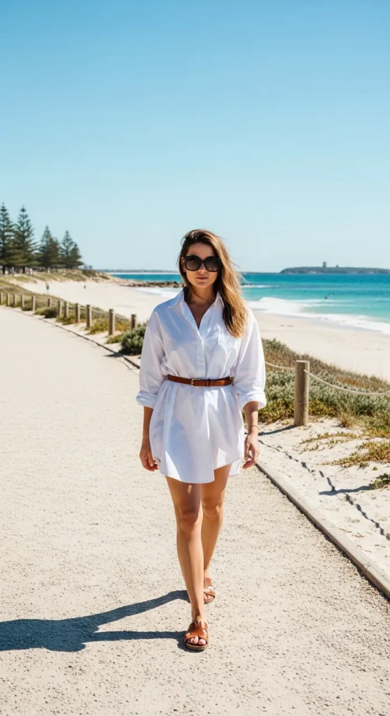 An oversized cotton shirt dress feels breezy and relaxed for Perth afternoons. The loose structure lets the wind move through the fabric while maintaining a stylish minimal look.