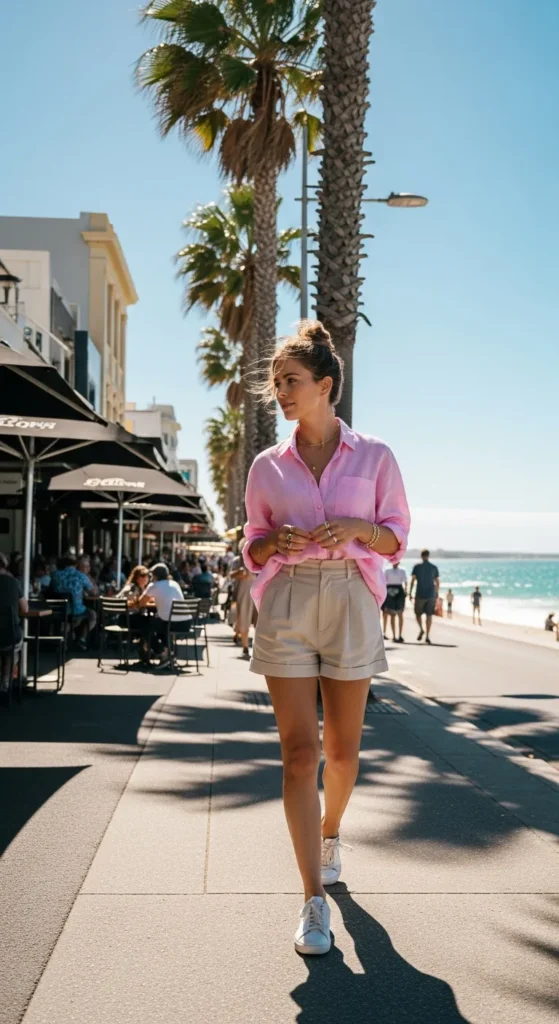 A pastel oversized button-up worn half-tucked into linen shorts feels easygoing yet stylish. The gentle colors soften the look while staying breathable for Perth’s summer warmth.