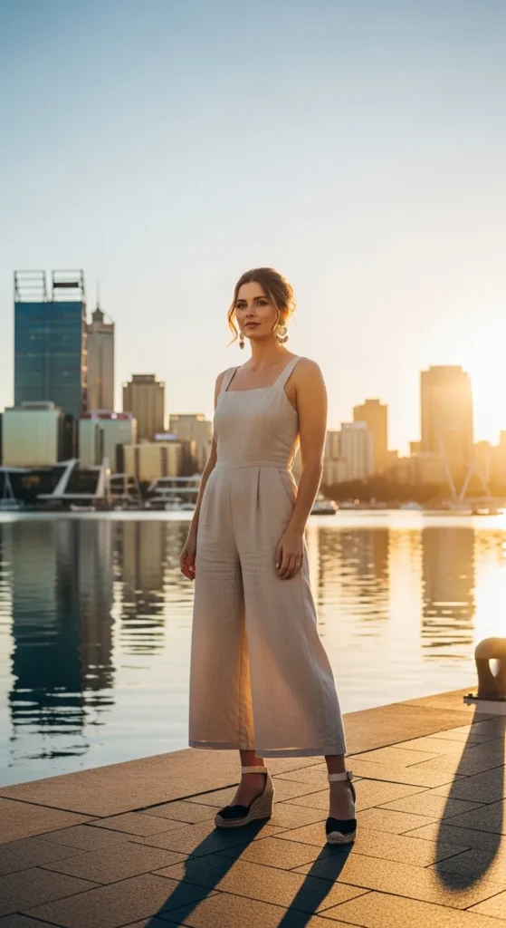 A linen jumpsuit offers effortless elegance while staying comfortable in the heat. The single-piece outfit feels modern and easy for city exploring or waterfront dinners.