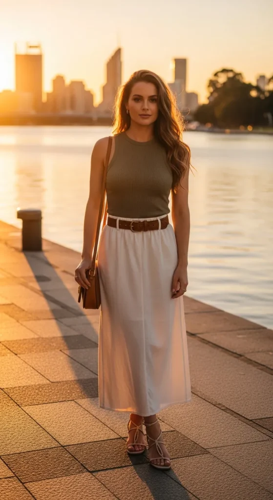 A flowy cotton maxi skirt paired with a fitted ribbed tank balances comfort and shape. The movement of the skirt works beautifully in coastal wind while the fitted top keeps the outfit structured.