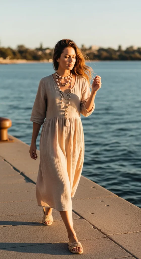 Stylist Suggestion: Add layered shell necklaces and loose beach waves. The shells echo the coastal setting and bring subtle texture to the outfit without overpowering the softness of the dress.