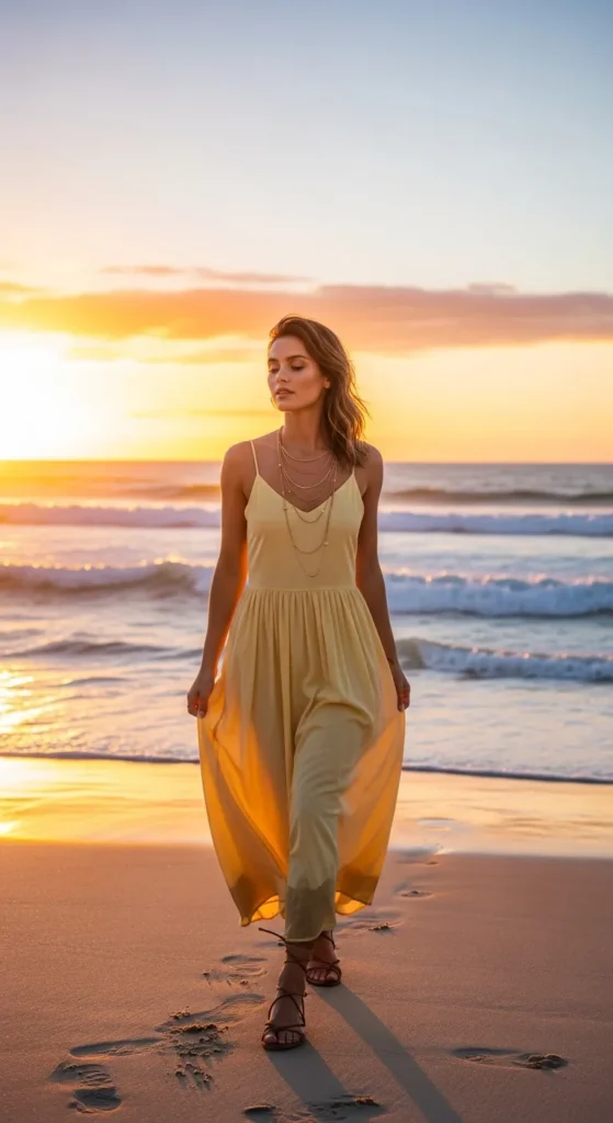 Stylist Suggestion: Choose delicate gold layered necklaces and strappy sandals. The gold jewelry reflects sunset light and enhances the warm tone of the dress.