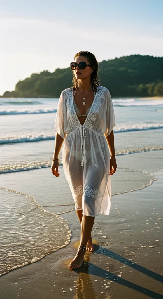 A semi-sheer kaftan over a bikini transitions seamlessly from beach to café.