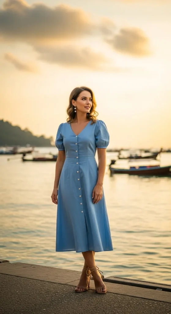 A halter midi dress in ocean blue mirrors the Andaman Sea. It’s ideal for beachfront dinners or sunset cruises.