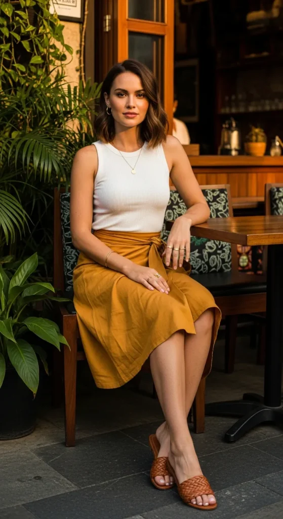 A mustard wrap skirt adds a pop of warmth, paired with a fitted ribbed tank.