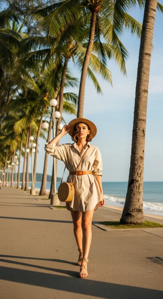 A loose cotton shirt dress cinched with a belt feels comfortable yet styled for exploring island streets.