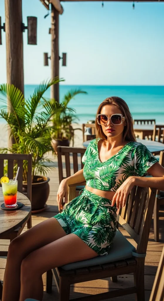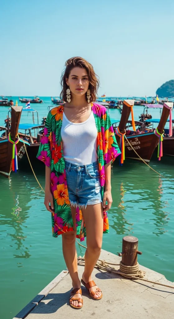 A lightweight tropical kimono layered over a simple tank and high-rise denim shorts gives playful island energy. It’s ideal for boat tours and casual beachside cafés.
