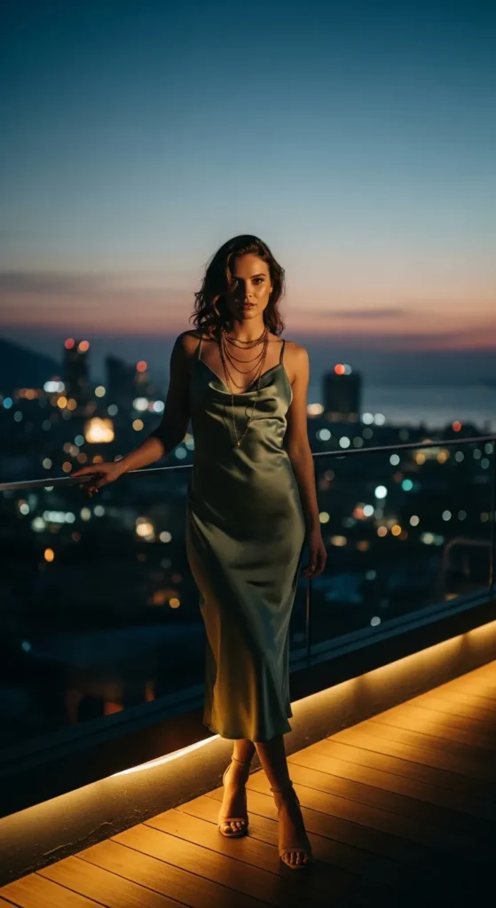 A satin sage slip dress feels light yet elevated for rooftop cocktails in Phuket. The subtle sheen catches evening light beautifully without feeling overdressed.