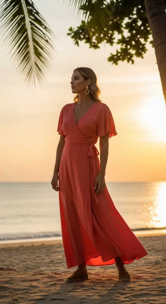 Stylist Suggestion: Pair it with woven espadrilles and delicate gold hoop earrings. The natural texture balances the bold coral, while gold jewelry catches the warm sunset light beautifully.