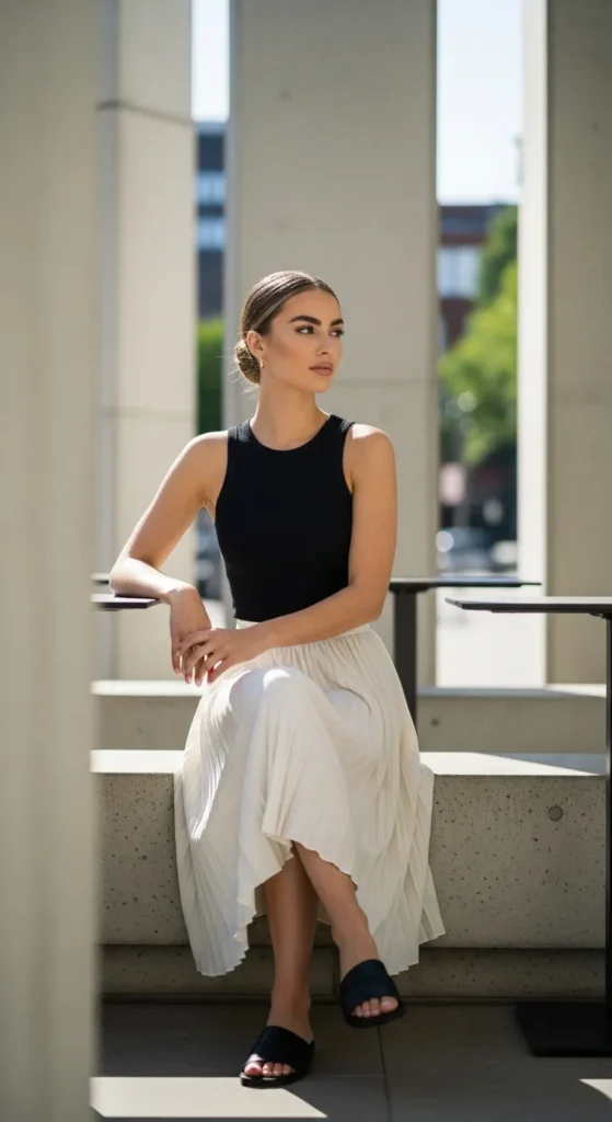 A simple black tank paired with a light-colored pleated skirt creates striking contrast while staying effortless. It’s a reliable summer outfit that feels confident and timeless.