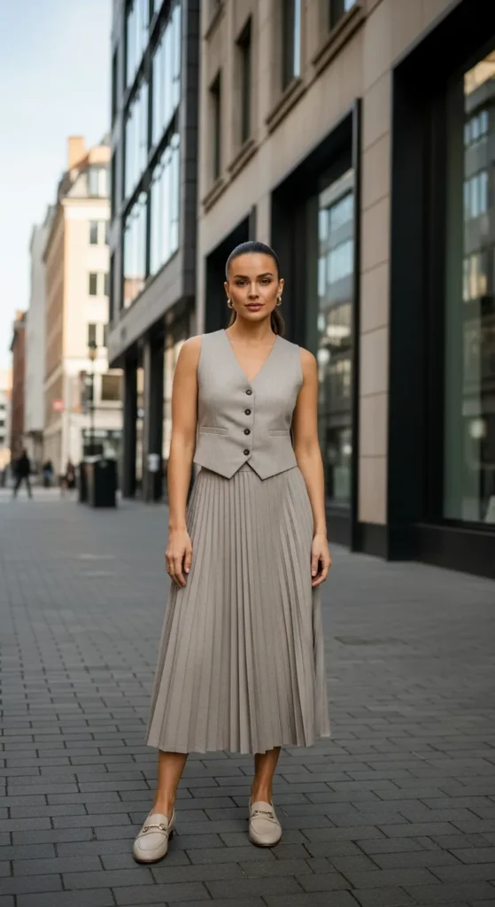 A tailored vest with a pleated skirt creates a smart, fashion-forward summer outfit. It feels confident, modern, and perfect for days when you want a sharper silhouette.