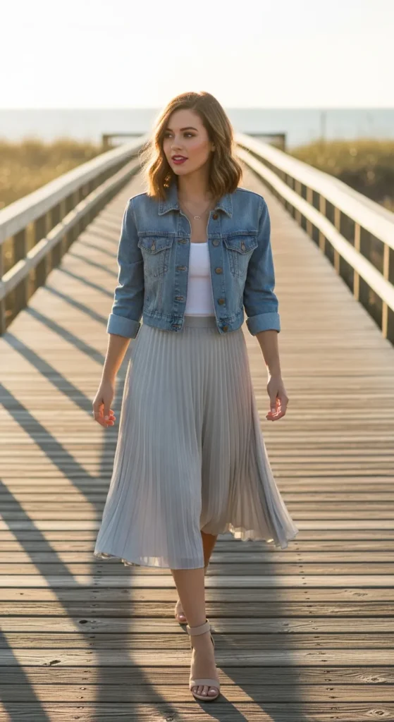 Layering a denim jacket over a pleated skirt gives structure to an otherwise soft outfit. This combination feels practical, familiar, and perfect for cooler summer mornings or evenings.