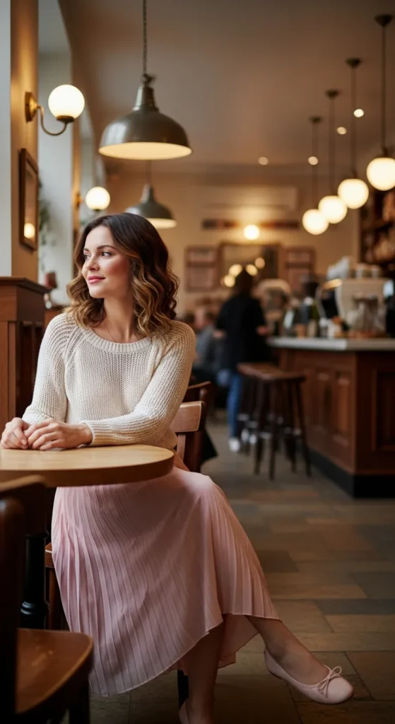 A lightweight summer sweater paired with a pleated midi skirt feels cozy yet breathable. This look works beautifully for air-conditioned spaces or breezy evenings.