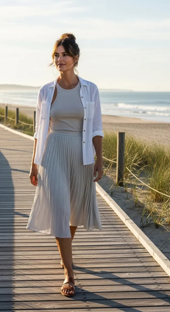 This outfit pairs an airy linen button-down with a pleated midi skirt for a look that feels intentional yet relaxed. It’s ideal for warm afternoons when you want to look styled without trying too hard.