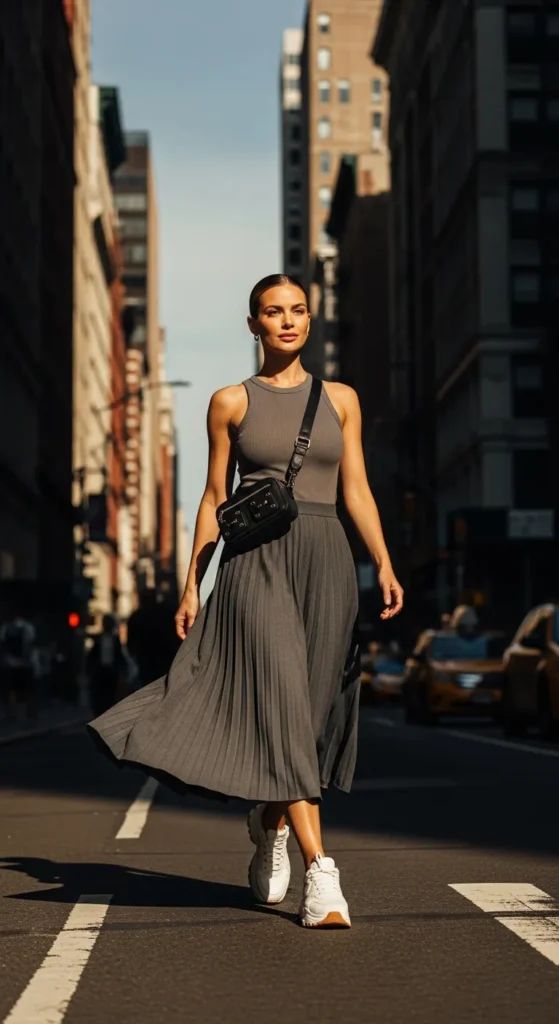 A ribbed tank with a pleated skirt creates a sporty-meets-feminine outfit that feels fresh and current. It’s an easy choice for active summer days that still call for style.
