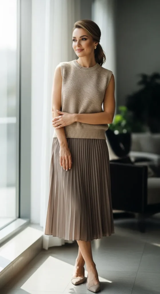 A sleeveless knit top paired with a neutral pleated skirt feels softly structured and polished. It’s a great option when you want something elevated yet comfortable for warm-weather plans.
