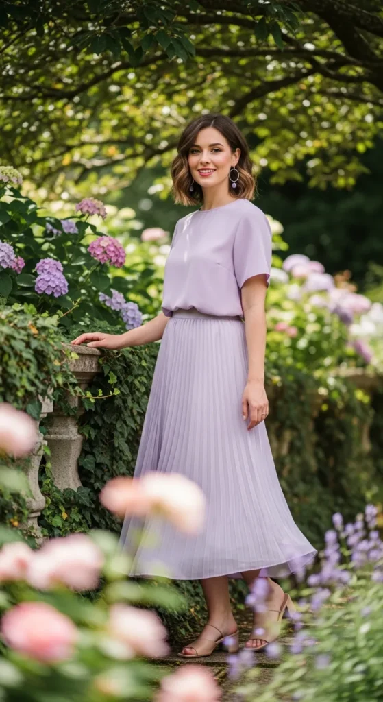 A pastel top paired with a similarly toned pleated skirt creates a cohesive, calming summer look. The monochromatic feel makes the outfit appear thoughtfully styled with minimal effort.