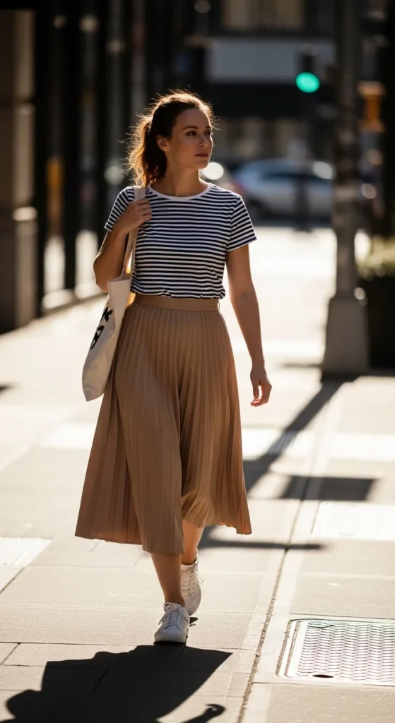 A striped tee brings classic charm to a pleated skirt, making the outfit feel relaxed and familiar. It’s perfect for summer errands, casual lunches, or spontaneous plans.