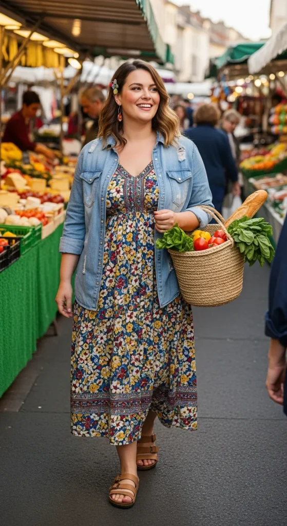 An empire waist dress flows gently over curves, while a denim shirt adds casual structure. This outfit feels relaxed yet styled, perfect for spring outings.
