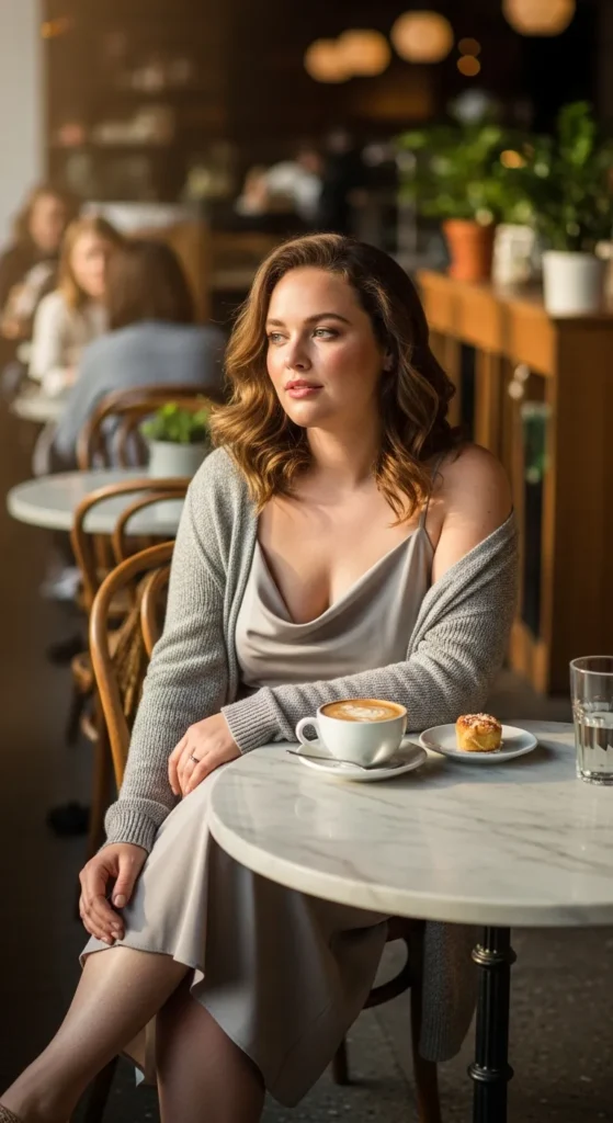 A soft cardigan layered over a slip dress adds coverage without hiding your shape. This look feels effortless and cozy, perfect for spring evenings when the weather is unpredictable but style still matters.