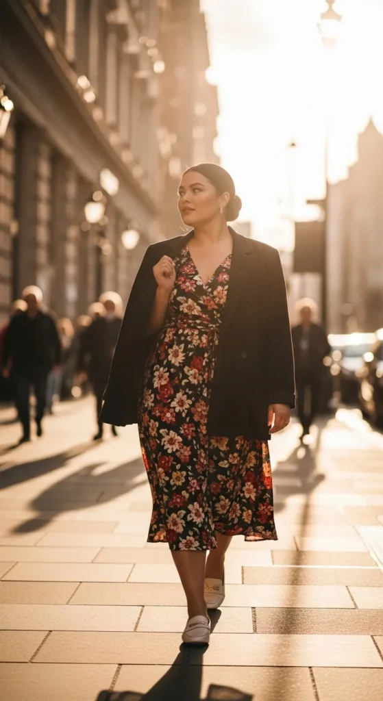 A relaxed fit blazer layered over a floral dress creates a polished yet approachable spring outfit. It’s perfect for transitioning from daytime plans to casual evening gatherings.