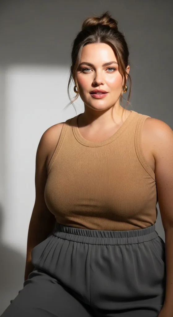 A ribbed tank offers subtle structure, while lightweight trousers keep things breathable. This outfit feels simple, flattering, and ideal for warmer spring days.