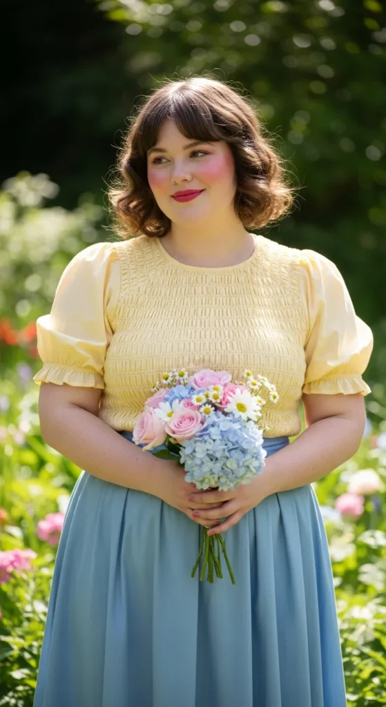 A smocked top naturally stretches and shapes the body, while an A line skirt flows gracefully. This combination feels youthful, airy, and perfect for enjoying warm spring afternoons.