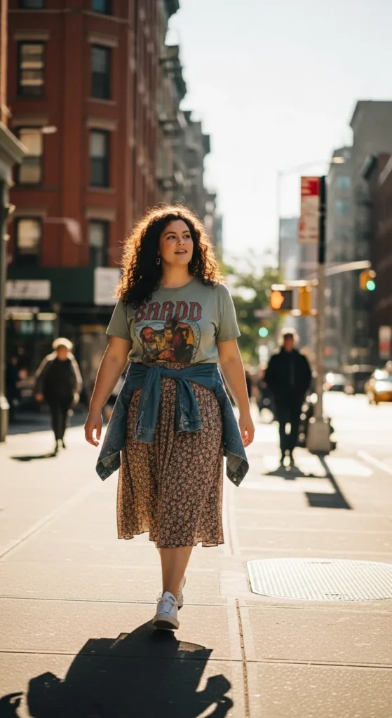 A relaxed graphic tee paired with a midi skirt creates an effortless mix of casual and feminine. It feels youthful, comfortable, and perfect for spring days on the go.