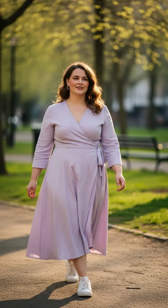 A flowy wrap dress in breathable fabric hugs curves gently while creating a natural waistline. Paired with clean sneakers, this outfit feels fresh, confident, and perfect for spring walks, coffee dates, or casual weekends.