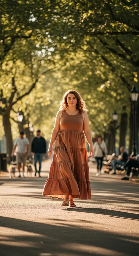 A tiered maxi dress moves beautifully and offers comfort without clinging. Paired with flat sandals, it feels breezy and ideal for warm spring days spent outdoors.