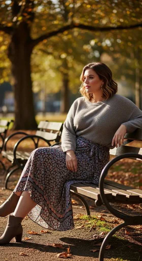 A wrap skirt allows adjustability and movement, while a soft sweater balances comfort and style. This outfit feels cozy yet light for early spring days.