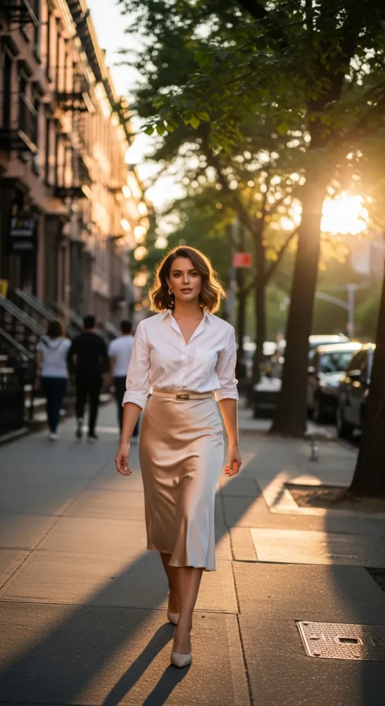 A crisp white button-down tucked into a flowing satin midi skirt creates a graceful contrast between structure and softness. The movement of the skirt adds elegance while the shirt keeps the outfit feeling intentional and polished.
