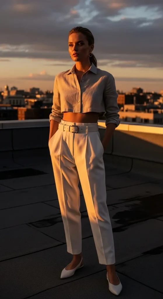 A cropped linen shirt styled with high-waisted trousers creates a modern polished summer outfit that feels both stylish and breathable.