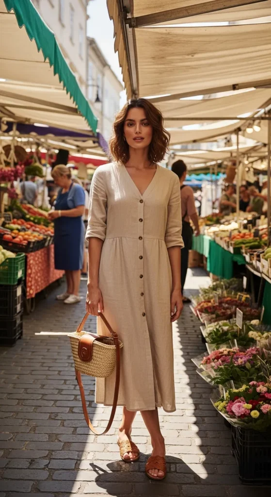 A linen button-front dress feels timeless, breathable, and effortlessly elegant. The structured buttons and natural fabric create a clean silhouette that always looks polished.