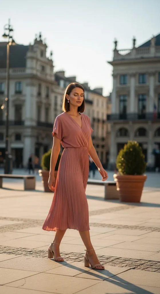 A pleated midi dress moves beautifully with every step, creating a graceful and elegant summer outfit that feels polished yet comfortable.