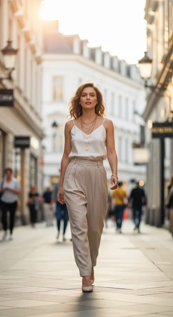 A silky camisole paired with pleated linen pants creates a smooth and airy summer outfit that feels luxurious yet relaxed. The shine of silk against matte linen gives the outfit quiet elegance.