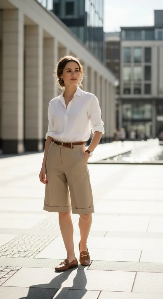 Tailored Bermuda shorts paired with a relaxed linen shirt create a polished yet breathable summer outfit. The longer shorts keep the look sophisticated while the linen shirt keeps it comfortable.