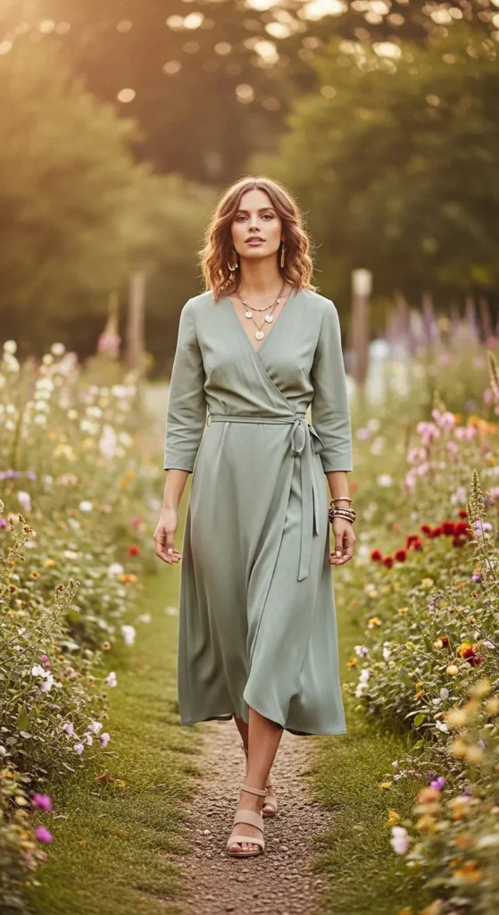 A wrap midi dress naturally creates an elegant silhouette by defining the waist and allowing fluid movement. Lightweight fabric makes it perfect for warm summer days while still looking refined.