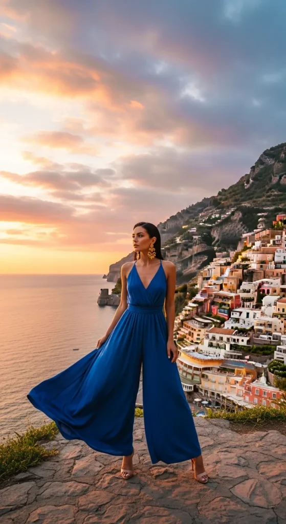 A flowing coral wrap maxi dress catches the golden sunset light perfectly against Positano’s pastel cliffs. The movement of the fabric feels romantic and effortless while keeping you cool during seaside dinners and terrace strolls.