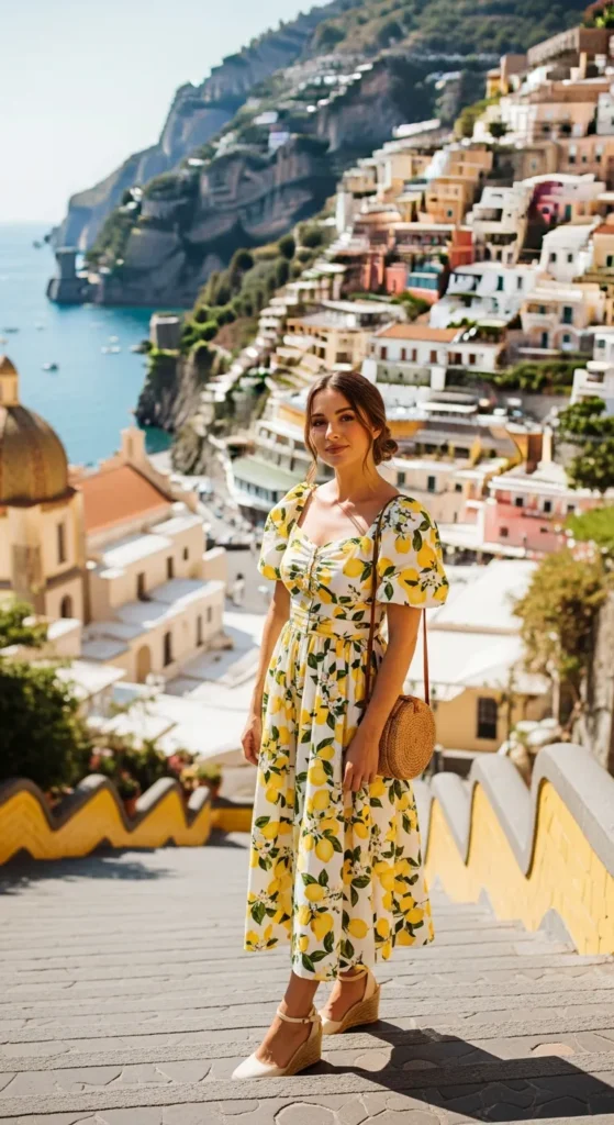 Nothing says Italy like lemons. A bright yellow lemon-print midi dress with puff sleeves feels playful and instantly photogenic near tiled staircases and café tables overlooking the sea.