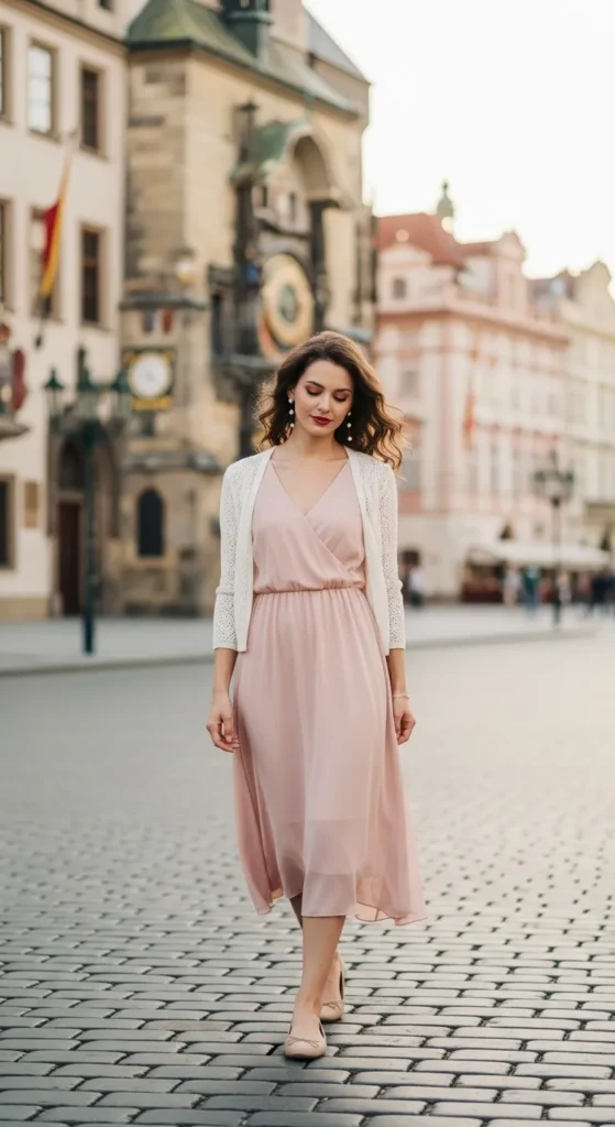 A blush midi dress flowing gently in the Prague breeze feels like it belongs in Old Town Square. The soft silhouette moves beautifully against cobblestones, while a light knit cardigan keeps the romance practical and cozy.