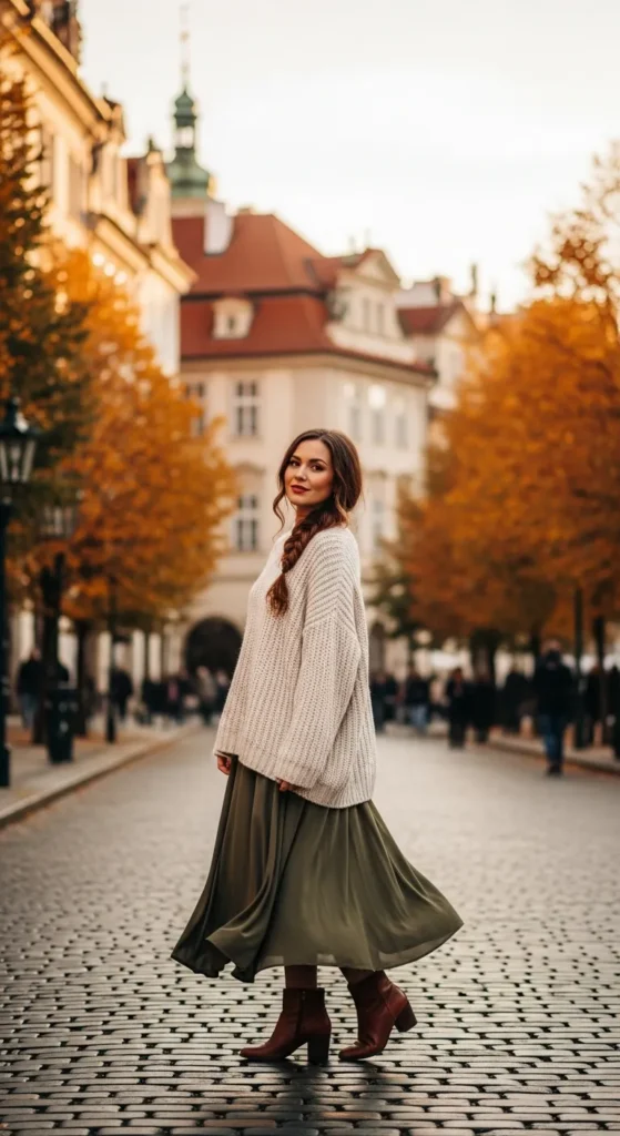 A chunky knit sweater paired with a lightweight flowing midi skirt gives you contrast that feels romantic yet grounded for fall strolls.