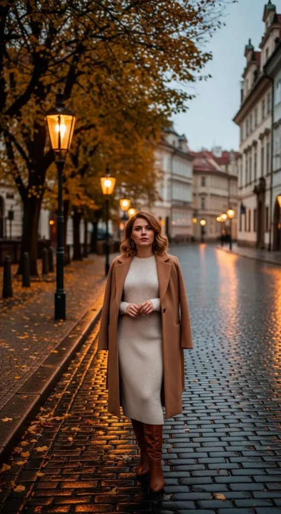 In autumn, a cream knit dress layered under a tailored camel coat feels cozy and refined. The textures complement Prague’s amber leaves and old-world charm.