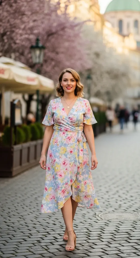 A floral wrap dress feels naturally romantic in Prague’s springtime air. The adjustable waist creates shape while staying comfortable for long museum visits and café hopping.