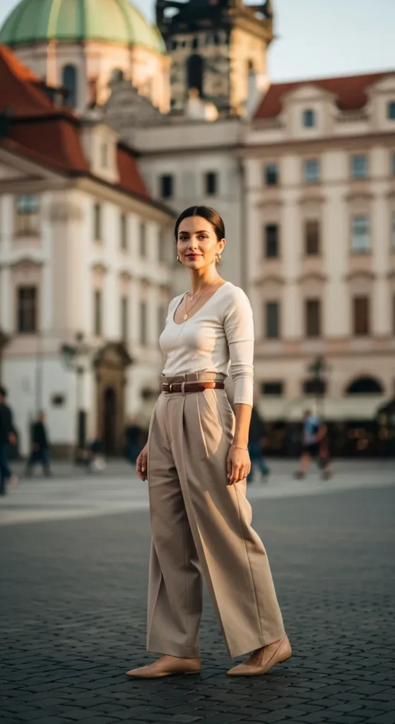 Wide-leg trousers in soft beige paired with a fitted blouse feel polished yet feminine. This look transitions seamlessly from daytime sightseeing to an evening dinner near Old Town Square.