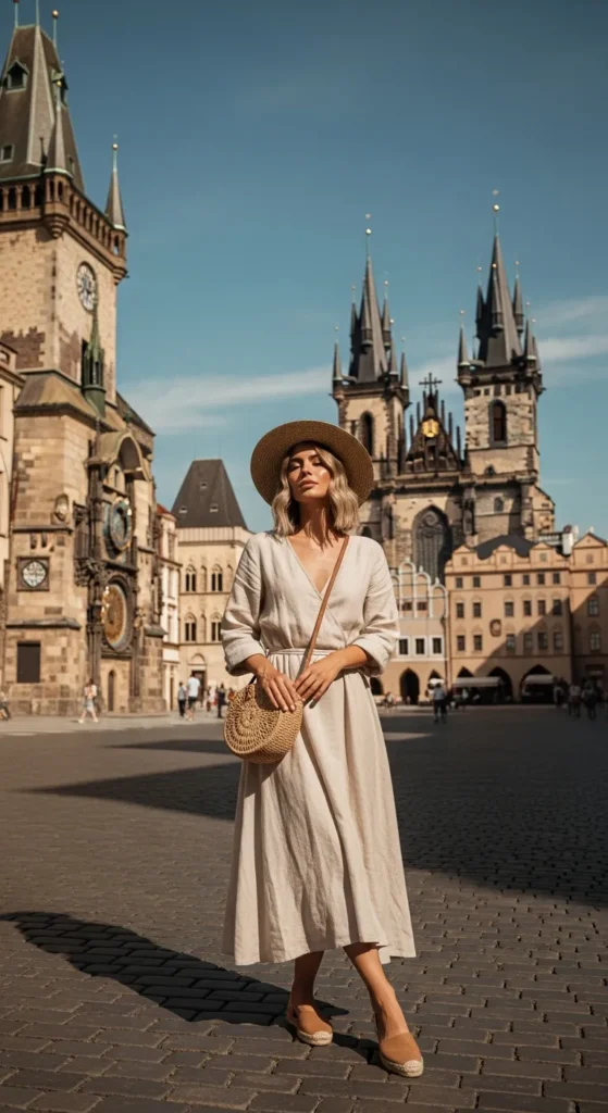 A breezy linen dress is perfect for warm Prague summers. The breathable fabric keeps you cool while maintaining a soft romantic aesthetic.